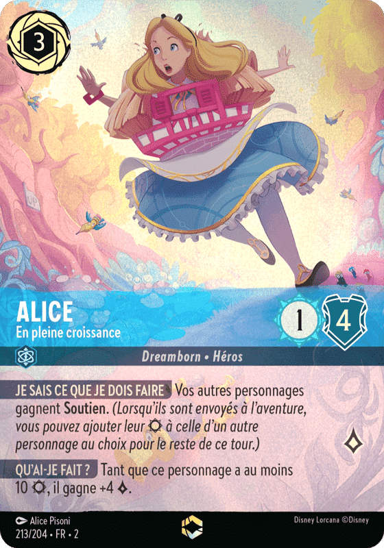L’autre pilier n’est pas un mot-clé mais un “type”: la classification Floodborn. Nés de la crue d’encre, ces Glimmers sont des versions métamorphosées de personnages connus et, surtout, ils exploitent massivement Alter (Shift). Beaucoup d’entre eux indiquent “Alter X” et se posent par‑dessus une version du même nom pour un coût réduit. L'Ascension des Floodborn insistent sur ce duo Floodborn + Alter — par exemple avec Flynn Rider – Son plus grand fan (Alter 2) ou Mulan – Réflexion (Alter 2) — pour illustrer comment la "montée en puissance" se traduit en jeu : évolution rapide et nouvelles capacités.