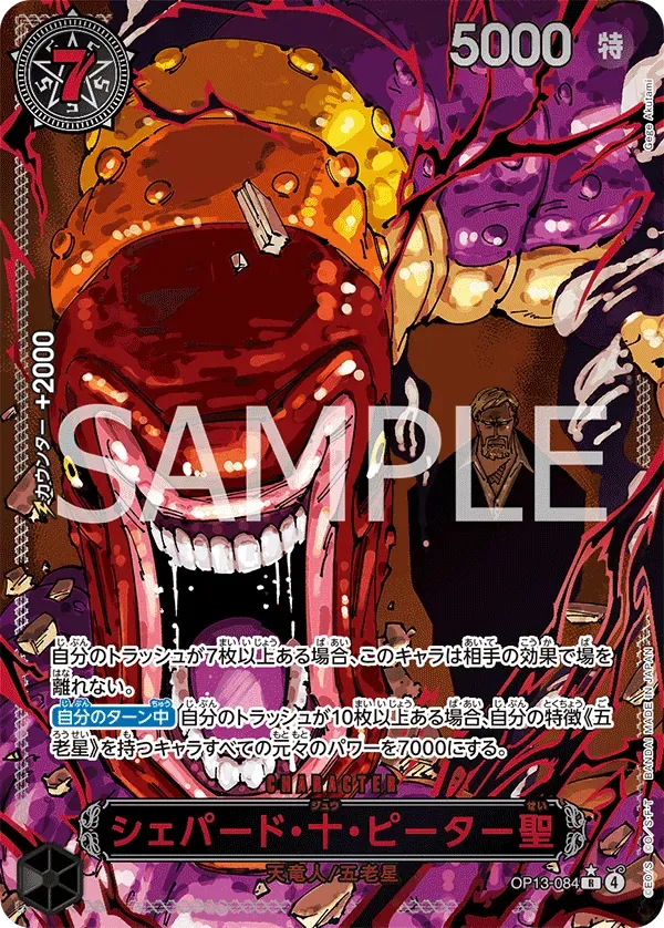 Gege Akutami, pilier de Weekly Shonen Jump depuis 2018, a marqué une génération avec Jujutsu Kaisen et son approche du surnaturel. Pour One Piece Card Game, il a croqué le Gorosei au complet. Shepherd Ju Peter, Nusjuro, Warcury, Mars et Saturn : cinq cartes qui capturent toute la menace des plus hautes sphères du Gouvernement Mondial. Du pur Akutami, reconnaissable entre mille.